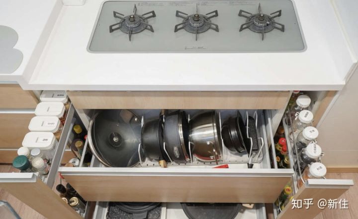 比如灶臺下做成大抽屜,收納家里各種鍋,兩側做成拉籃,正好可以放調料。